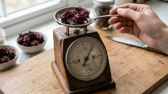 찻숟가락으로 수북이 3개 넣었다가 완전히 떫고 쓴 음료가 됐습니다. 히비스커스는 소량으로도 색이 진하게 우러나는 허브입니다. 처음엔 1.5g(찻숟가락 1개 기준) 부터 시작하세요.